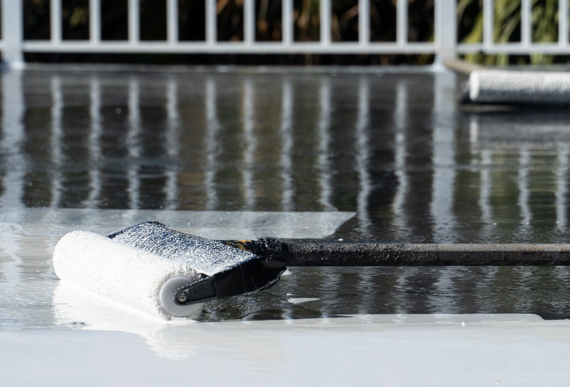 The process for replacing an existing waterproof membrane on a South Florida patio deck, rooftop deck, balcony or roof, first involves tearing up the existing floor surface, whether it is tile, epoxy or concrete. The surface is then sanded, grinded down and inspected for any imperfections that need to be fixed. The waterproofing coatings are then applied, creating a formidable membrane.